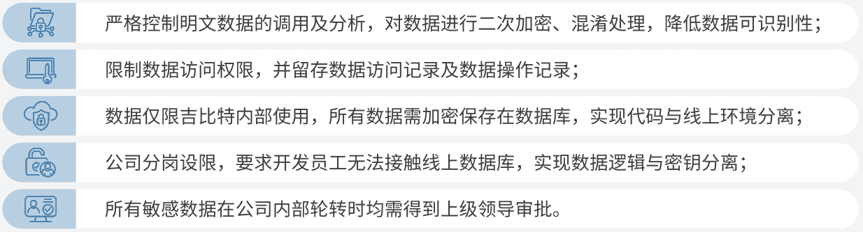 公司对用户个人信息实施脱敏处理,,,严格限制用户信息用途,,数据使用完成后集中归档处理。。。为进一步确保数据处理过程的安全,,公司根据实际的业务工作分岗设限,,,最大程度保护数据隐私安全,,,如在生产网络中的加密数据由研发部门员工负责编写加、、解密程序,,,但其无法直接访问到加密后的数据库;程序的加、、解密密钥由运维员工单独配置。。