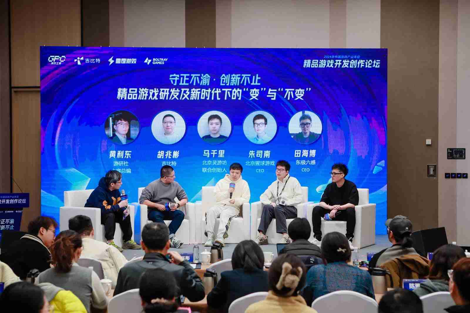 圆桌对话环节,,,,在游研社内容总编黄利东的主持下,,,,yaxin111CTO胡兆彬、、北京灵游坊联合创始人马千里、、、北京猩球游戏CEO朱司南、、东极六感CEO田海博等四位嘉宾围绕“守正不渝、、、创新不止——精品游戏研发及新时代下的‘变’与‘不变’”这一主题分享了各自在精品游戏开发理念及工程能力搭建方面的见解和经历,,,,并就行业变化下游戏人需要坚守的理念等展开交流探讨。。。